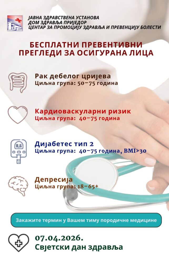 Povodom Svjetskog dana zdravlja, koji se obilježava 7. aprila, Centar za promociju zdravlja i prevenciju bolesti Doma zdravlja Prijedor organizuje danas, u 11 časova, informativno-preventivnu aktivnost ispred ove zdravstvene ustanove. Građani će imati priliku da se upoznaju sa značajem preventivnih pregleda koje finansira Fond zdravstvenog osiguranja Republike Srpske, a koji su dostupni u timovima porodične medicine.