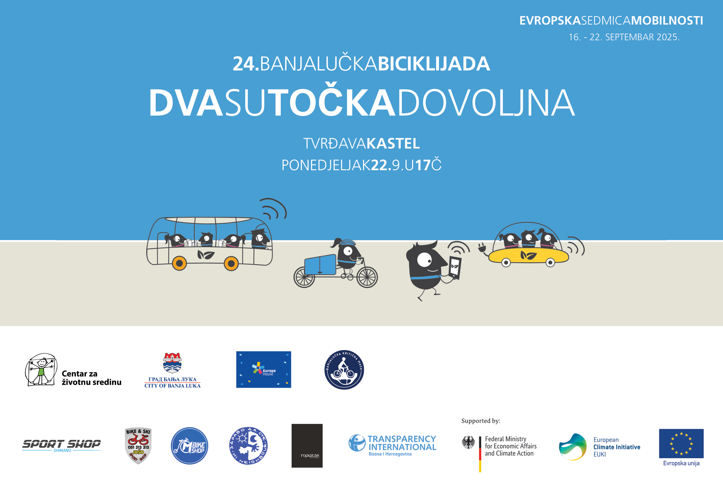 Danas je počela Evropska sedmica mobilnosti i trajaće do 22. septembra koji je ujedno i Svjetski dan bez automobila i biće i ove godine u Banjaluci obilježen banjalučkom biciklijadom „Dva su točka dovoljna“, dvadeset četvrtom po redu. Banjalučku biciklijadu organizuju Centar za životnu sredinu (nacionalni koordinator Evropske sedmice mobilnosti za Bosnu i Hercegovinu), u saradnji sa Gradskom upravom Grada Banja Luka, Europe House i inicijativom građana Banjalučka kritična masa.