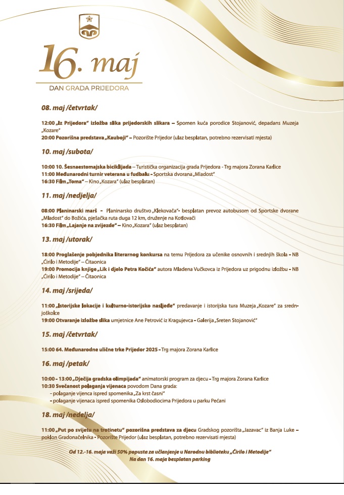 U čevrtak, 15. maja, biće održana 64. Međunarodna ulična trka “Prijedor 2025”, a u petak, 16. maja, od 10.00 do 13.00 časova Dječija gradska olimpijada na Trgu majora Zorana Karlice, te polaganje vijenaca na spomenike borcima poginulim u Drugom svjetskom ratu i u Odbrambeno-otadžbinskom ratu.