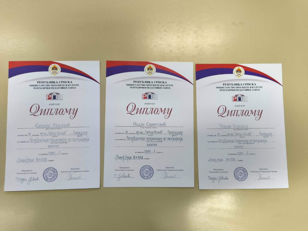 Učenice devetog razreda Osnovne škole “Petar Kočić” iz Prijedora ostvarile su izuzetan uspjeh na Republičkom takmičenju iz geografije, osvojivši prvo mjesto u konkurenciji vršnjaka iz cijele Republike Srpske.