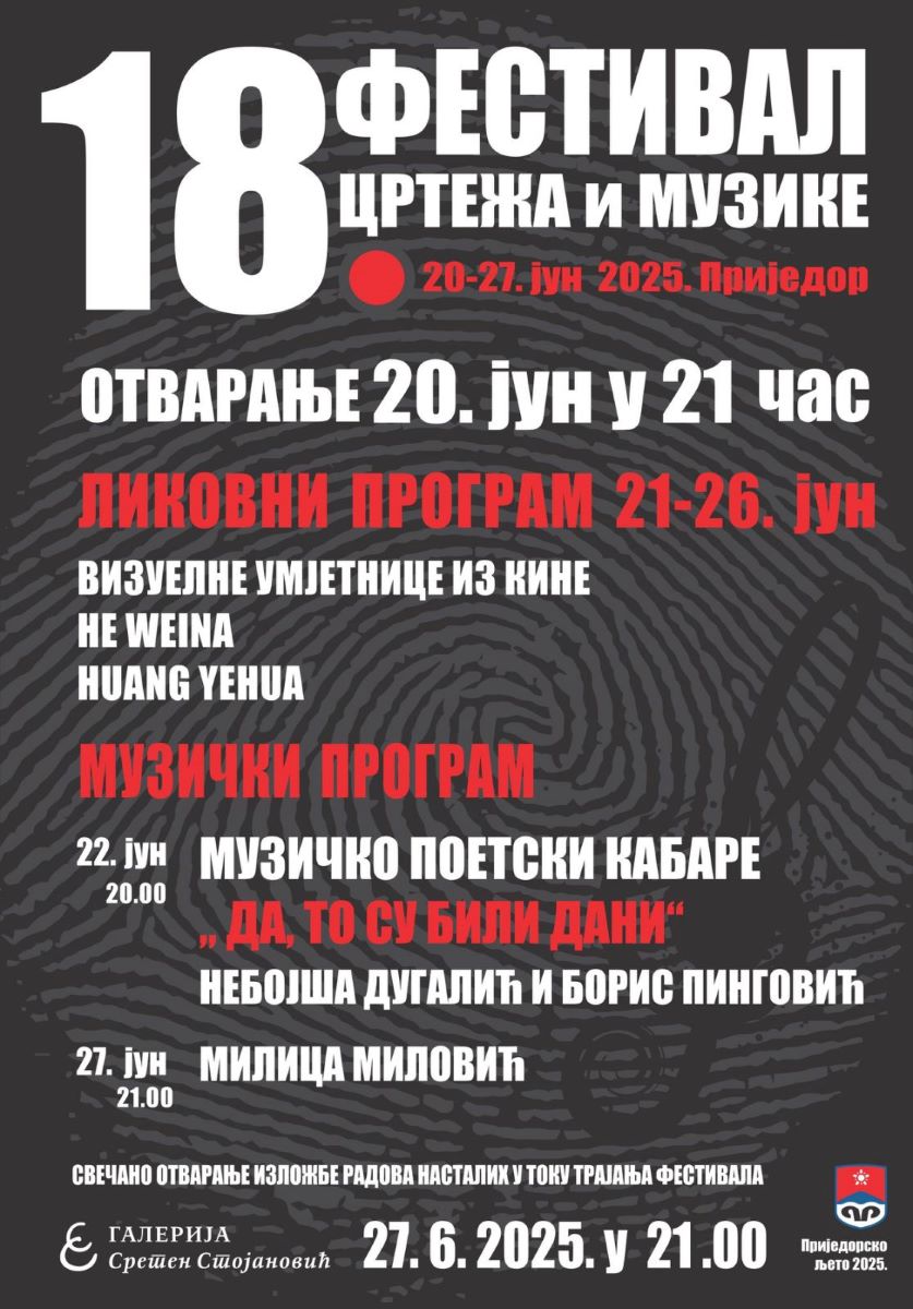 U Galeriji “Sreten Stojanović”, u okviru “Prijedorskog ljeta 2025” danas u 21 čas počinje 18. Festival crteža i muzike. Ovaj izuzetno važan kulturni događaj koji svake godine privuče veliku pažnju Prijedorčana, ove godine biće je jedinstven i po tome što se po prvi put u Republici Srpskoj i Gradu Prijedoru predstavljaju likovni umjetnici iz Kine.