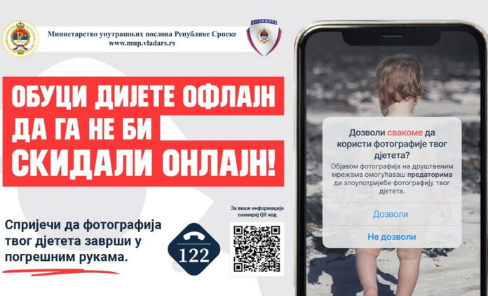 Ministarstvo unutrašnjih poslova Republike Srpske pokrenulo je preventivnu kampanju pod nazivom “Obuci dijete oflajn da ga ne bi skidali onlajn”, s ciljem upozoravanja na ozbiljne rizike koje nosi objavljivanje fotografija nage ili polunage djece na internetu i društvenim mrežama. Kako ističu iz MUP-a RS, fotografije i videosnimci nage djece sve češće postaju meta osoba koje vrše krivična djela seksualne eksploatacije i zlostavljanja. Zabrinjavajuće je to što upravo najbliži – roditelji, rodbina, pa čak i prijatelji – često nesvjesno doprinose dostupnosti takvog sadržaja, dijeleći ga putem društvenih mreža, e-mailova ili aplikacija za komunikaciju.