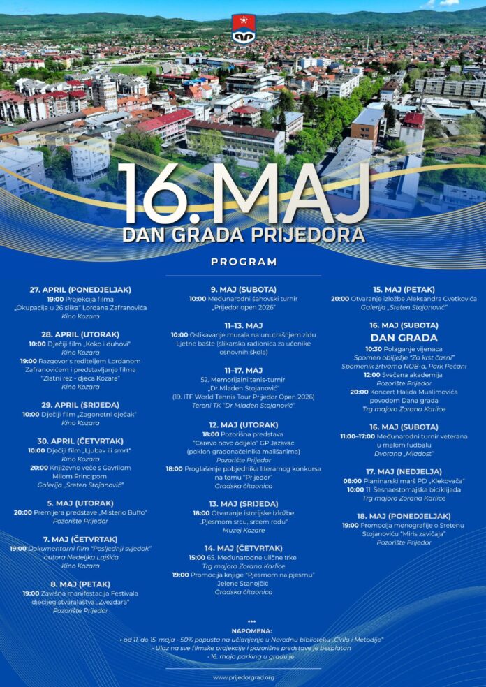 Dan grada Prijedora – 16. maj, biće obilježen nizom događaja za sve generacije, koji će početi danas i trajaće do 18. maja, najavio je danas šef Kabineta gradonačelnika Branko Mudrinić.